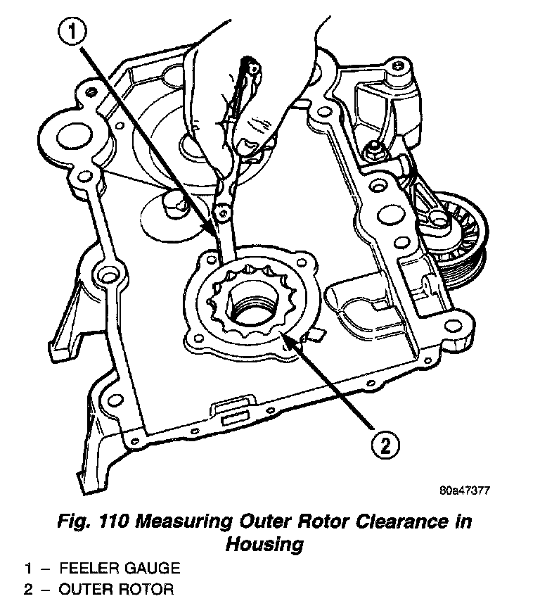(3) Slide outer rotor into chain case cover, press to one side with fingers and measure clearance between rotor and case (Fig. 110). If measurement is 0.19 mm (0.007 inch) or more, and outer rotor is within specification, replace chain case cover only.
