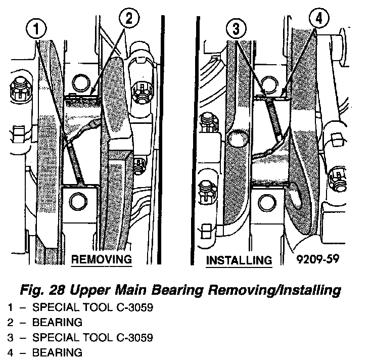 (1) Start bearing in place, and insert Main Bearing Tool C-3059 into oil hole of crankshaft (Fig. 28).