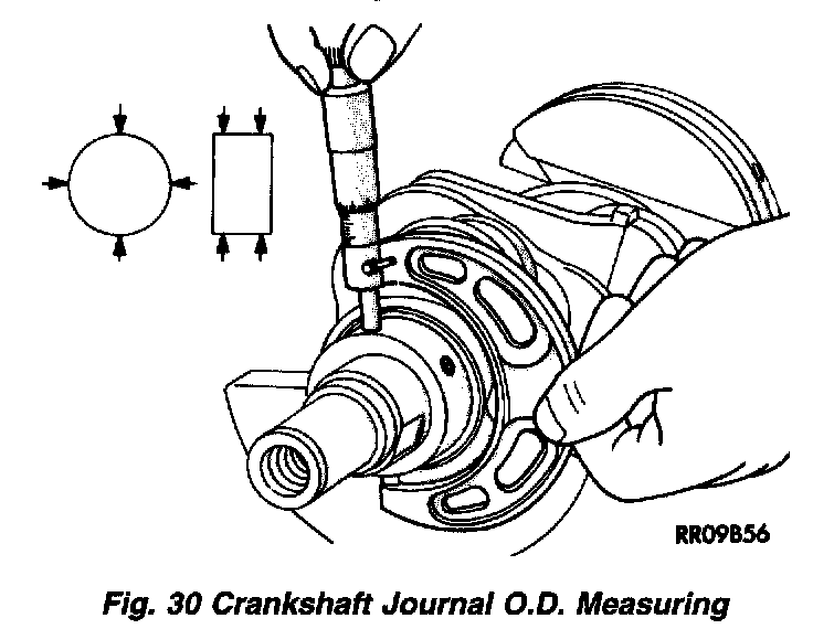 (1) Measure the journal outside diameter as shown in (Fig. 30). Refer to Engine, Specifications for crankshaft specifications.