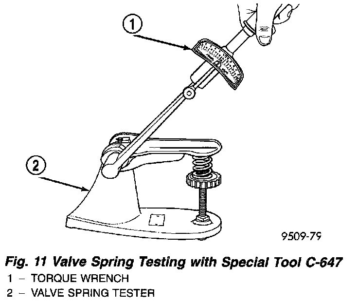 The valve springs should be tested whenever removed for inspection, reconditioning, or replacement (Fig. 11). The valves have two springs, an inner and an outer. Before testing, the two springs should be separated.