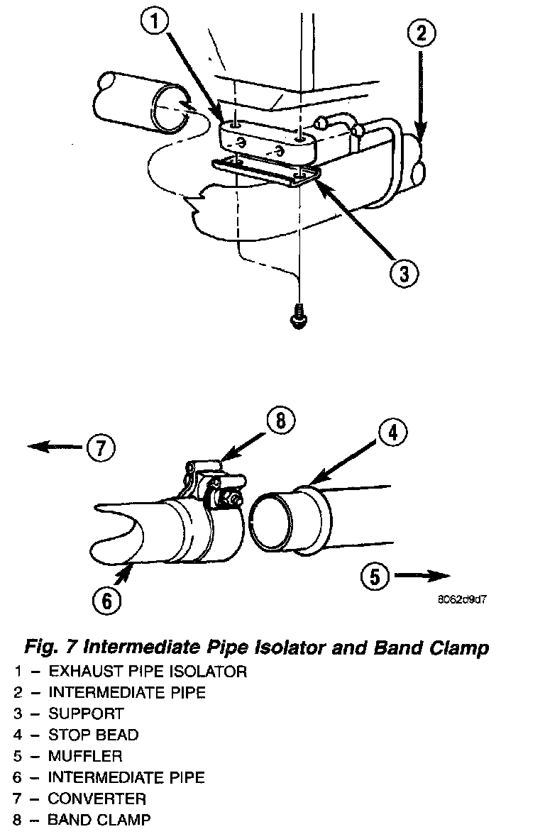 (2) Install muffler hanger and isolators. Tighten fasteners to 28 Nm (250 inch lbs.).