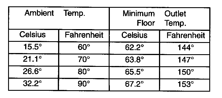Engine coolant is provided to the heater system by two 16 mm (5/8 inch inside diameter) heater hoses. With engine idling at normal running temperature, set the control to maximum heat, floor, and high blower setting. Using a test thermometer, check the air temperature coming from the floor outlets, refer to Temperature Reference Chart.