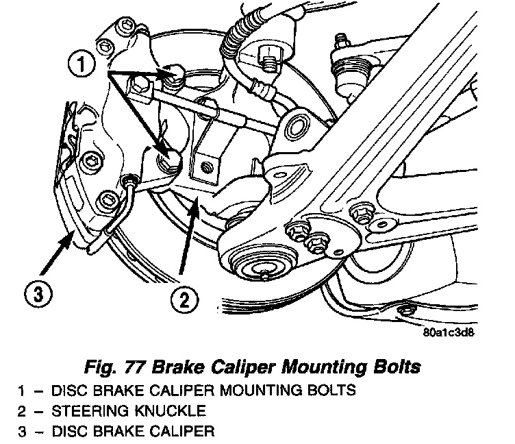 4. Remove the 2 bolts attaching the brake caliper to the steering knuckle. Remove the brake caliper from the steering knuckle.