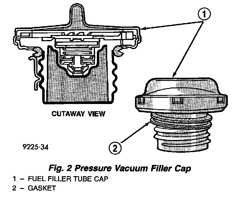 The fuel filler tube cap seals the fuel tank when threaded onto the filler neck. For safety, the cap contains pressure-vacuum relief valves. A malfunction in the system or damage to the fuel lines could cause excessive fuel tank pressure. The relief valves prevent possible excessive pressure or vacuum build-up in the fuel tank.