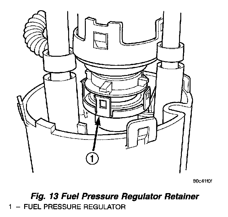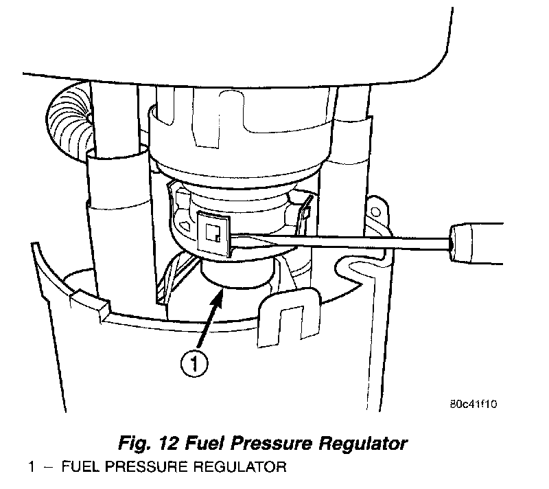 The fuel pressure regulator is part of the fuel pump module (Fig. 12). Remove the fuel pump module from the fuel tank to access the fuel pressure regulator. Refer to the Fuel Pump Module.