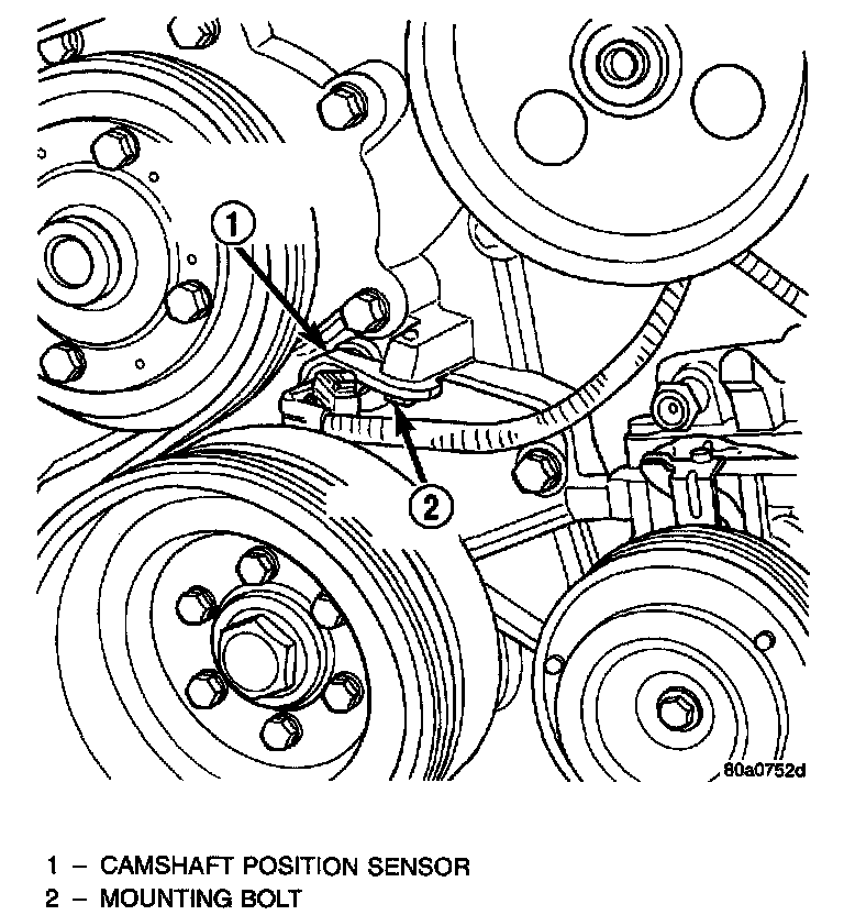 The camshaft position sensor is located on the timing chain case/cover on the left-front side of the engine.