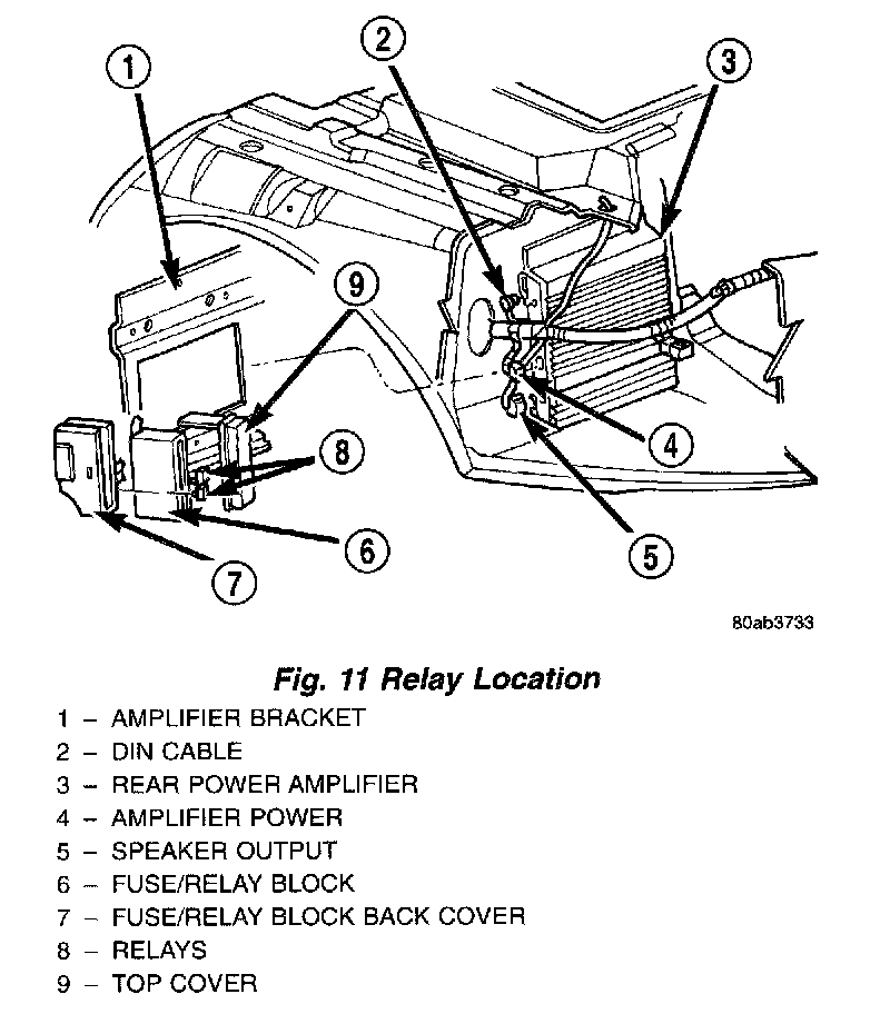 The relay is located in the trunk next to the stereo amplifier (Fig. 11). Check electrical terminals for corrosion and repair as necessary.