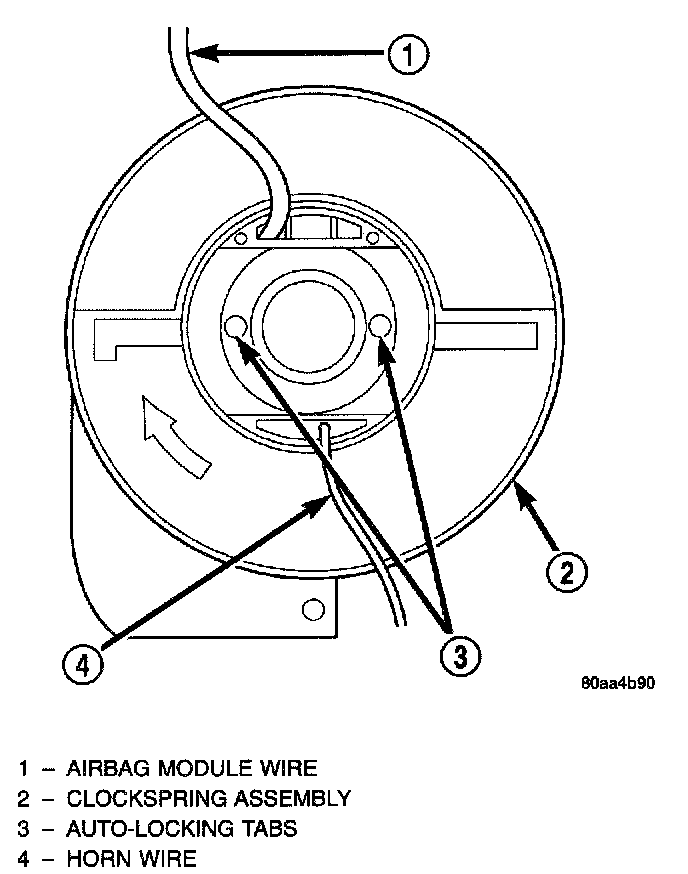 If the rotating tape within the clockspring is not positioned properly in relation to the steering wheel and the front wheels, the clockspring may fail during use. The clockspring must be centered if it is not known to be properly positioned, or if the front wheels were moved from the straight-ahead position with the clockspring removed during any service procedure.WARNING: THE AIRBAG SYSTEM IS A SENSITIVE, COMPLEX ELECTROMECHANICAL UNIT. BEFORE ATTEMPTING TO DIAGNOSE OR SERVICE ANY AIRBAG SYSTEM OR RELATED STEERING WHEEL, STEERING COLUMN, OR INSTRUMENT PANEL COMPONENTS YOU MUST FIRST DISCONNECT AND ISOLATE THE BATTERY NEGATIVE (GROUND) CABLE. THEN WAIT TWO MINUTES FOR THE SYSTEM CAPACITOR TO DISCHARGE BEFORE FURTHER SYSTEM SERVICE. THIS IS THE ONLY SURE WAY TO DISABLE THE AIRBAG SYSTEM. FAILURE TO DO THIS COULD RESULT IN ACCIDENTAL AIRBAG DEPLOYMENT AND POSSIBLE PERSONAL INJURY.