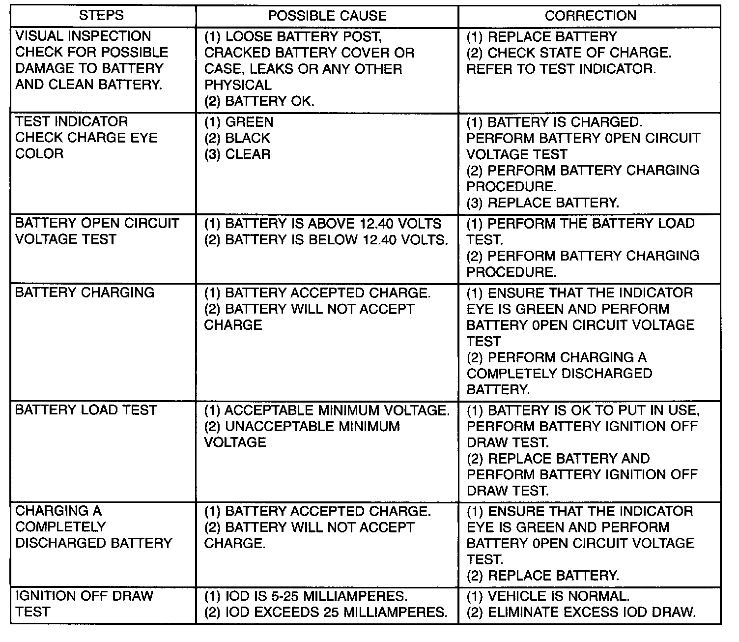 It is normal to have a small 5 to 25 milliamperes continuous electrical draw from the battery. This draw will take place with the ignition in the OFF position, and the courtesy, dome, storage compartments, and engine compartment lights OFF. The continuous draw is due to various electronic features or accessories that require electrical current with the ignition OFF to function properly. When a vehicle is not used over an extended period of approximately 20 days the IOD fuse should be pulled. The fuse is located in the power distribution center. Disconnection of this fuse will reduce the level of battery discharge. Refer to Battery Diagnosis and Testing table and to the proper procedures.
