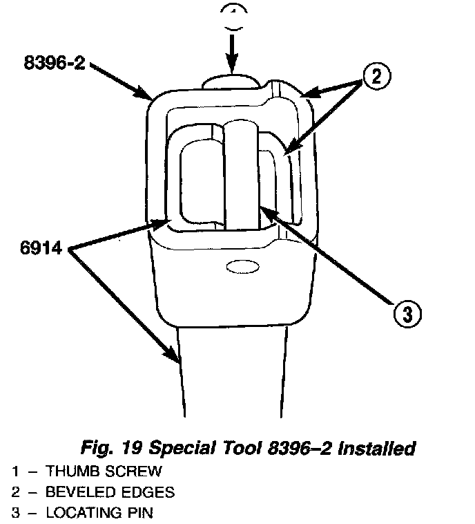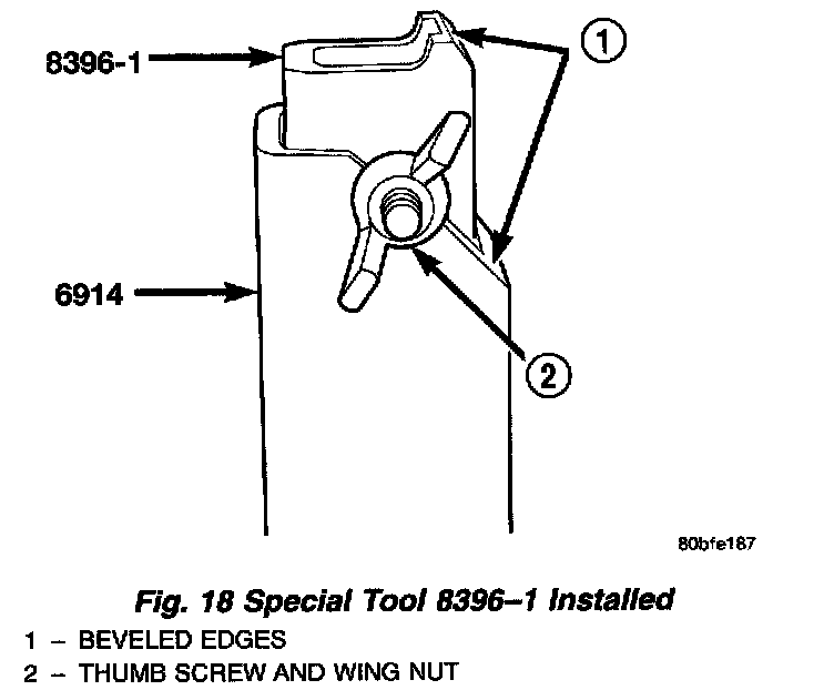 1. Place an Adapter, Special Tool 8396-1, inside the larger end of each Suspension Height Gage, Special Tool 6914, aligning the adapter thumb screw with the notch in the Fixture. The beveled edges on both tools should be on the same side as shown.