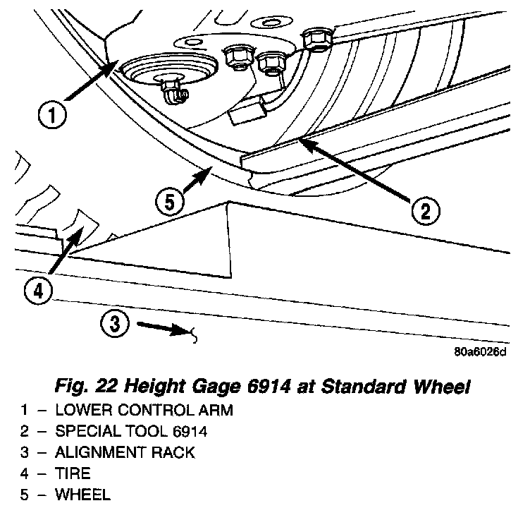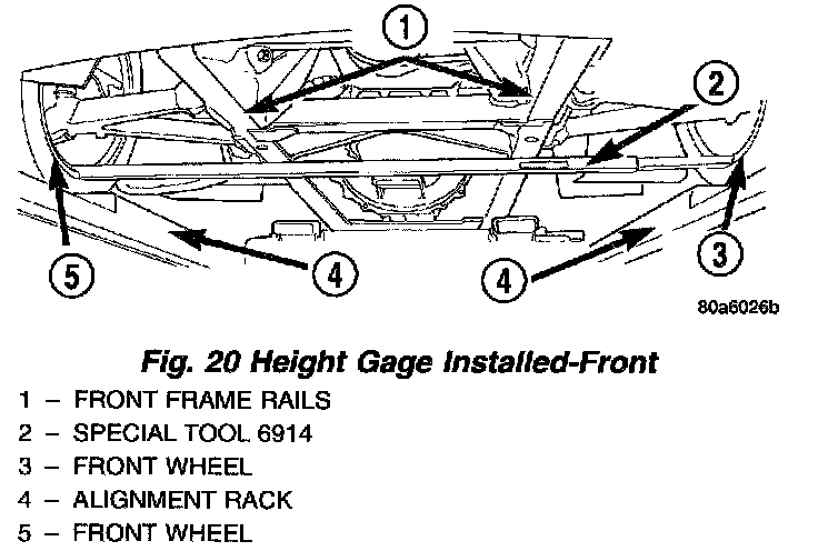 NOTE: When the suspension height gages are installed on the wheels, they must be positioned at the very bottom of the wheel rim. This is required to ensure the height checking fixtures are parallel to the bottom surface of the frame rails, which is required to achieve an accurate vehicle design height measurement.