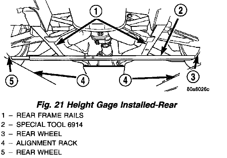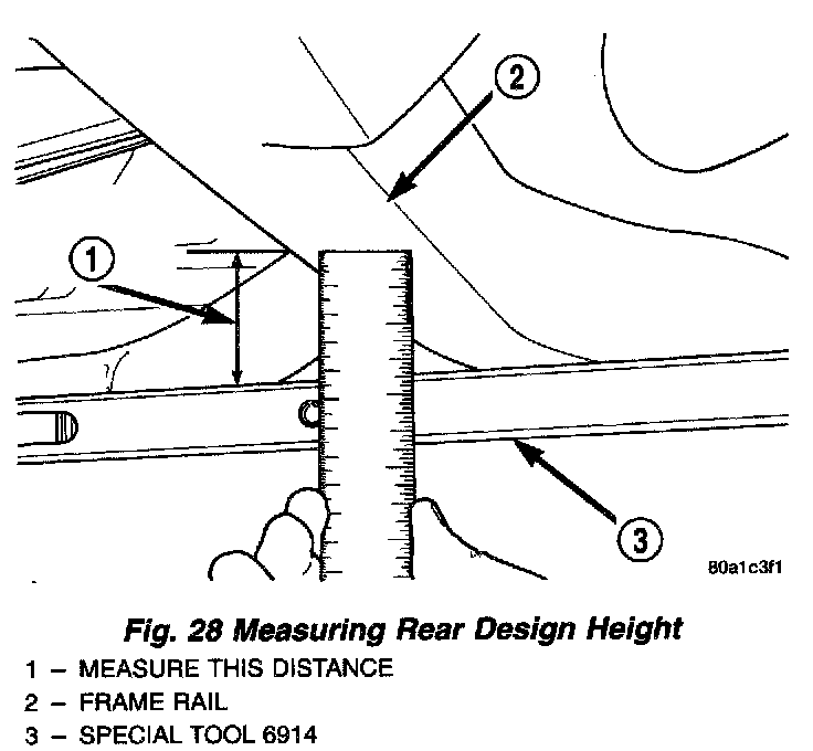 11. Measure and record the vehicle's rear curb height by measuring the distance between rear frame rails and the top surface of the Suspension Height Gage.