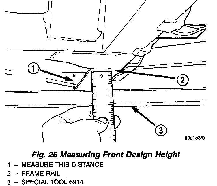 3. Measure the vehicle's front design height by measuring the distance between the top of the Suspension Height Gage and the frame rails.