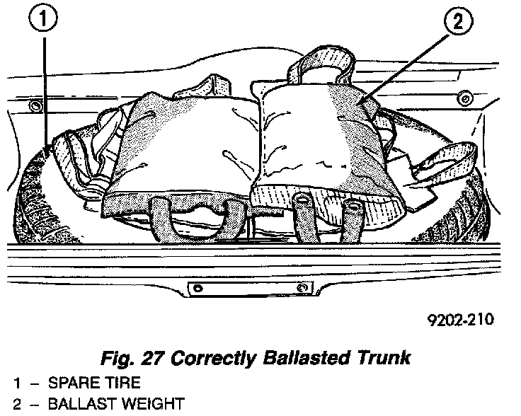 NOTE: The approximate total weight needed to lower the vehicle to its design height is 400 pounds depending on the suspension type. The weight distribution in the vehicle is approximately 330 in the passenger compartment (165 pounds per seat) and 70 pounds in the luggage compartment. If the spare tire is not in the trunk, approximately 40 additional pounds will need to be placed in the trunk to compensate for the tire. Vehicles equipped with the ACR suspension package will require additional weight in all listed places.
