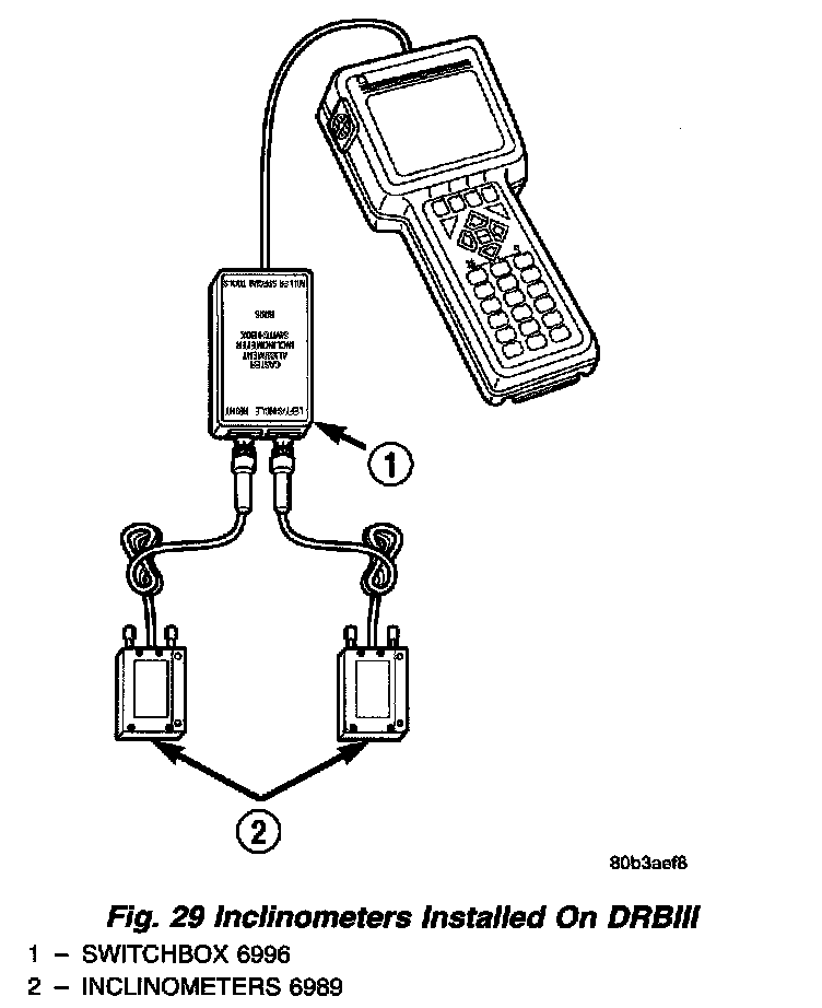 3. Attach the two inclinometers, Special Tool 6989, to the switch box. Only two inclinometers are supplied and should be used as a pair to measure either rear caster or front caster, one at a time.