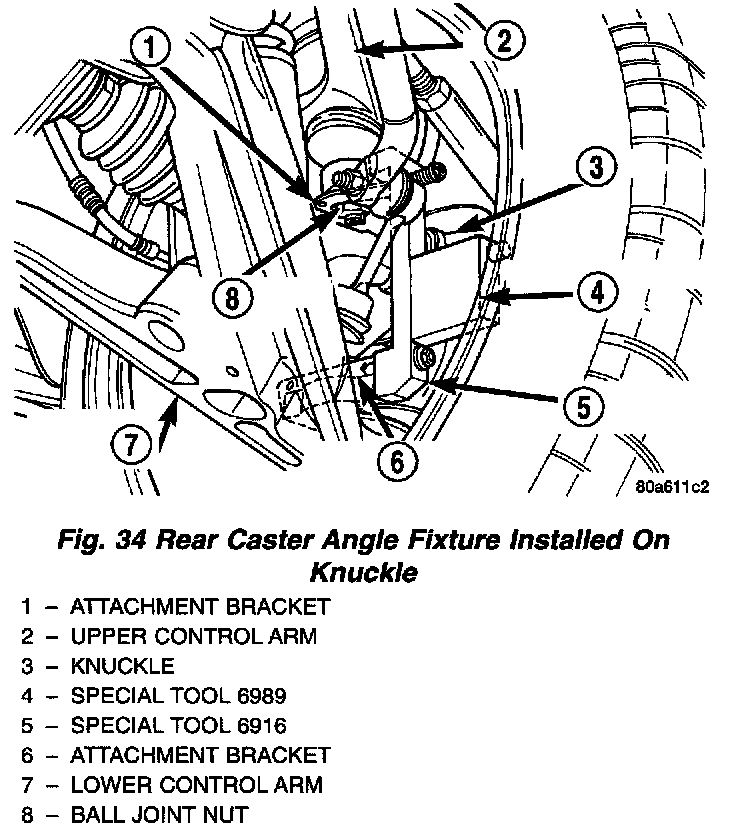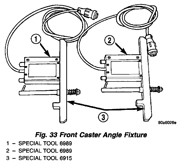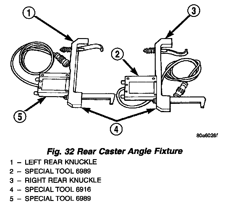 Both front and rear caster angle on the Viper is read. This is accomplished by reading caster directly off the front and rear knuckles through inclinometer sensors attached to the DRB III scan tool, rather than using the alignment machine's sweep method. Use Special Tools 6989, 6996, 6915, and 6916 which are included in the 96 Essential Viper Alignment Package.