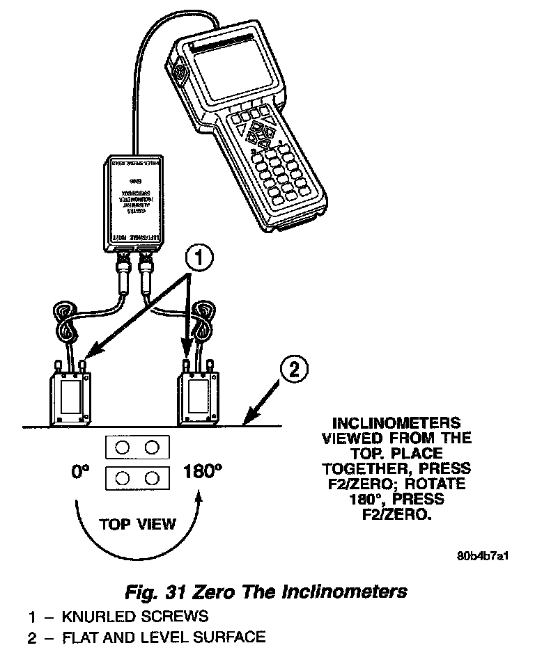 9. Zero the inclinometers: Place both inclinometers together on a known flat, level surface, such as the alignment rack, with the knurled ends of the fastening screws facing upward. Press F2. This zeros the inclinometers in one direction. Rotate the inclinometers 180 degrees in place, then press F2 again to zero both inclinometers in the other direction. The inclinometers are now ready to be installed on the vehicle.