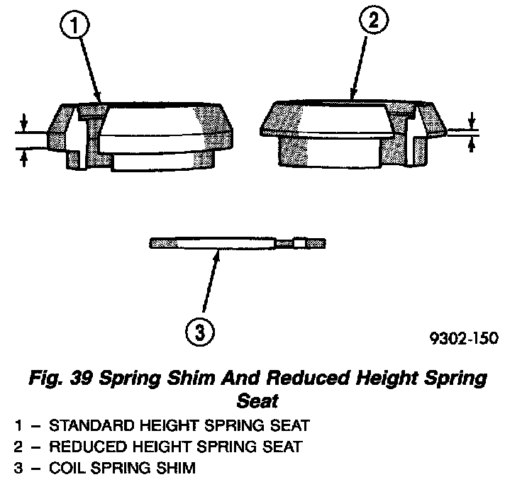 SHIMMINGOn vehicles with the standard suspension, spring shims or reduced height seats may be installed on the front or rear shock assemblies. Spring shim installation increases coil spring preload, thus raising the curb height of the vehicle. Reduced spring seat installation decreases coil spring preload, thus lowering the curb height of the vehicle.