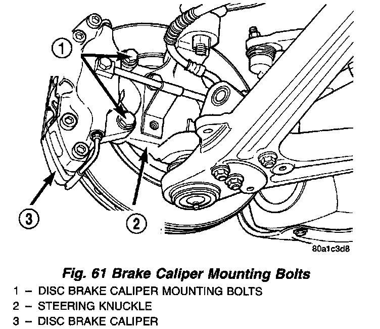 4. Remove the 2 bolts attaching the brake caliper to the steering knuckle. Remove the brake caliper from the steering knuckle.