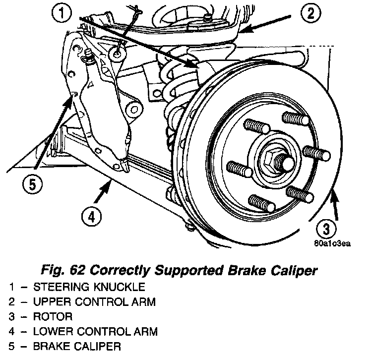 5. Support brake caliper by hanging it from the upper control arm with mechanics wire. Do not let brake caliper hang by brake flex hose.