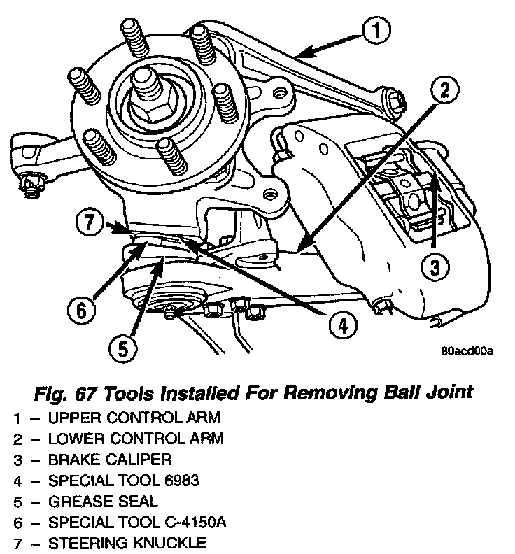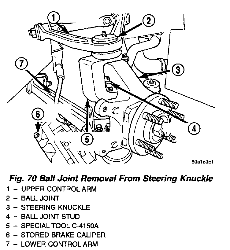 13. Remove the upper ball joint stud from the steering knuckle using Remover, Special Tool C-4150A.