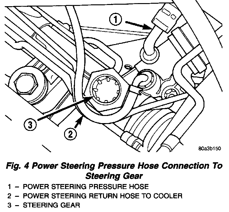 1. Remove the power steering fluid pressure hose from the steering gear. Allow the power steering fluid to drain from the hose.