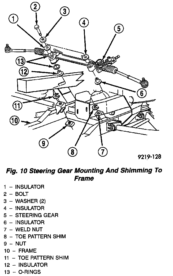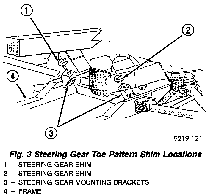 Front wheel toe pattern is critical in controlling a vehicle's directional stability, as the vehicles suspension moves through normal jounce and rebound travel. Toe pattern adjustment is done by installing (0.5 1.0, 1.5, or 3.0 mm) shims between steering gear and steering gear mounting brackets. A maximum of 9.5 mm (.375 inch) shimming is allowed between the steering gear and its mounting brackets. If steering gear is removed for any reason or a replacement steering gear is installed, the same thickness of shim MUST be reinstalled between steering gear and mounting brackets. This is necessary to maintain correct front wheel toe pattern of the vehicle, which is set during the vehicle's assembly alignment procedure.