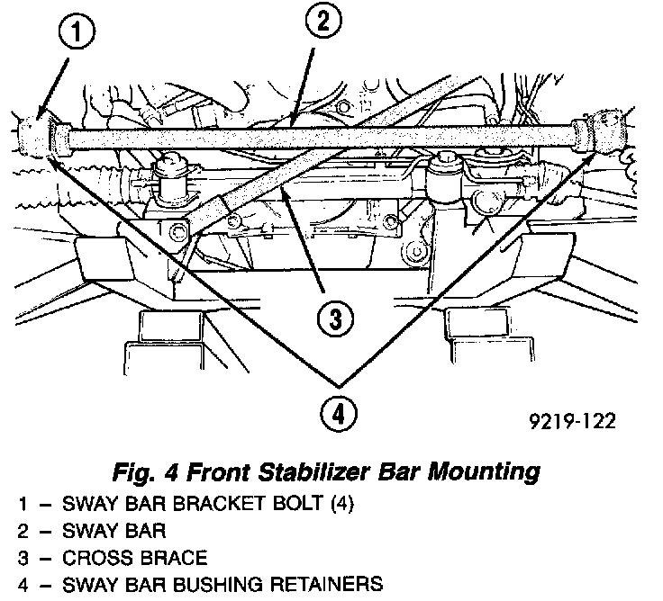 4. Remove the 4 bolts attaching the stabilizer bar bushing retainers to the frame rails. The stabilizer bar bushings and retainers do not have to be removed from the stabilizer bar.