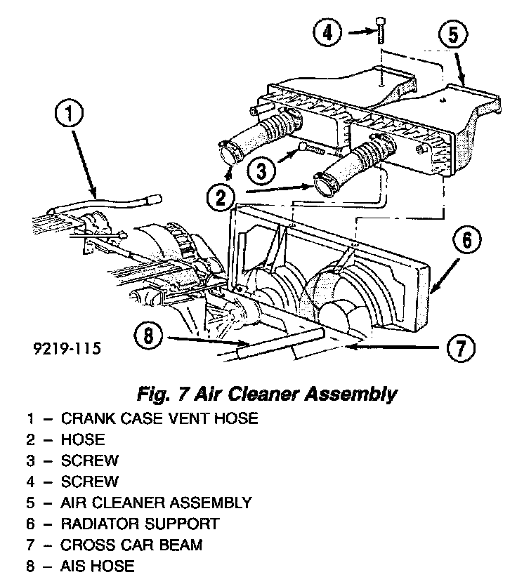 9. Remove the 2 fasteners that mount the air cleaner housing to the radiator support. Remove the fastener mounting the air cleaner housing to the cross car beam. Remove the wiring harness connector from the charge air temperature sensor in air cleaner housing. Remove the crank case vent hose and IAC hose from the air cleaner housing. Remove the hose clamps from the clean air hoses at the throttle bodies. Remove the complete air cleaner assembly from vehicle.