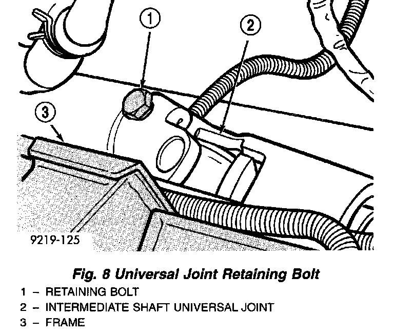 10. Install the universal joint to steering gear shaft retaining bolt. Tighten the retaining bolt to a torque of 41 Nm (30 ft. lbs.).