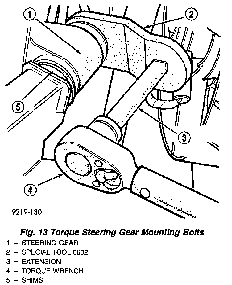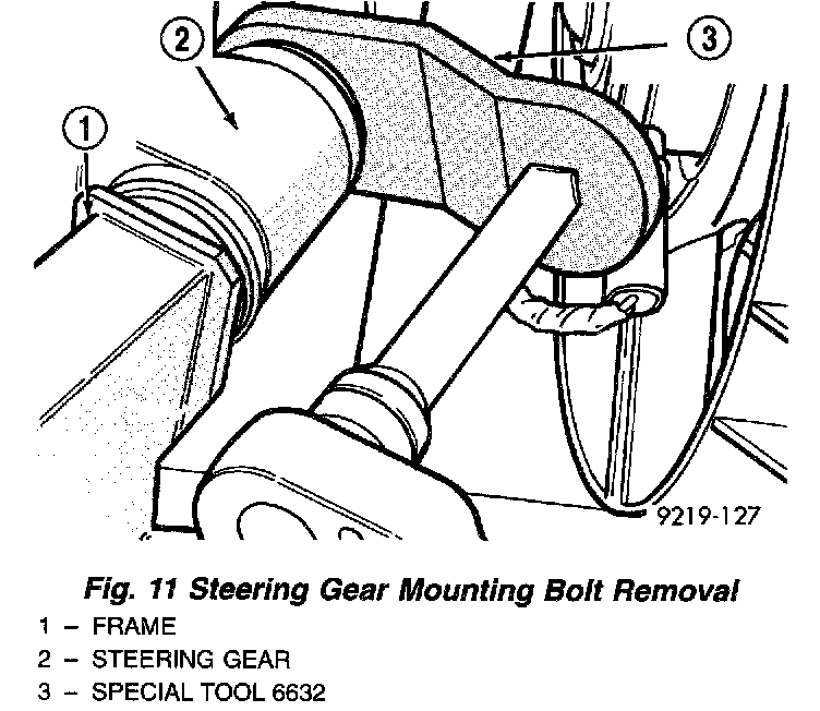 13. Using Adapter, Special Tool 6632, loosen the 2 bolts mounting the steering gear to the steering gear mounting brackets. After mounting bolts are loosened using adapter, remove bolts from steering gear.