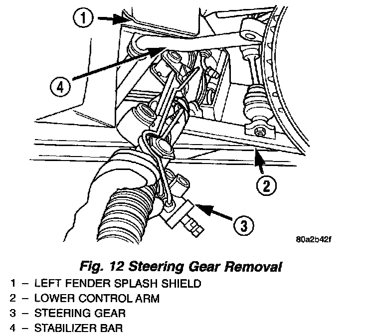14. Remove the steering gear from the vehicle by sliding it out left front fender well, forward of the steering knuckle.