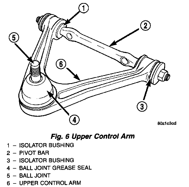 DESCRIPTIONThe front upper control arm used on this vehicle is an aluminum casting. It contains the front upper ball joint, which is threaded into the outer end of the control arm. A pivot bar spans between the inboard corners of the arm. The pivot bar attaches through two isolator bushings that are pressed into the control arm.