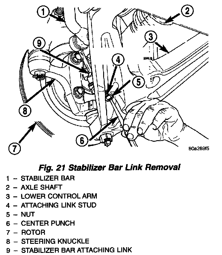 4. Remove the stabilizer bar link from lower control arm using the following procedure. Position the link nut at the end of the link stud. Position a center punch in the hole on the end of the link stud. Strike the center punch to remove the link stud~l from the lower control arm.