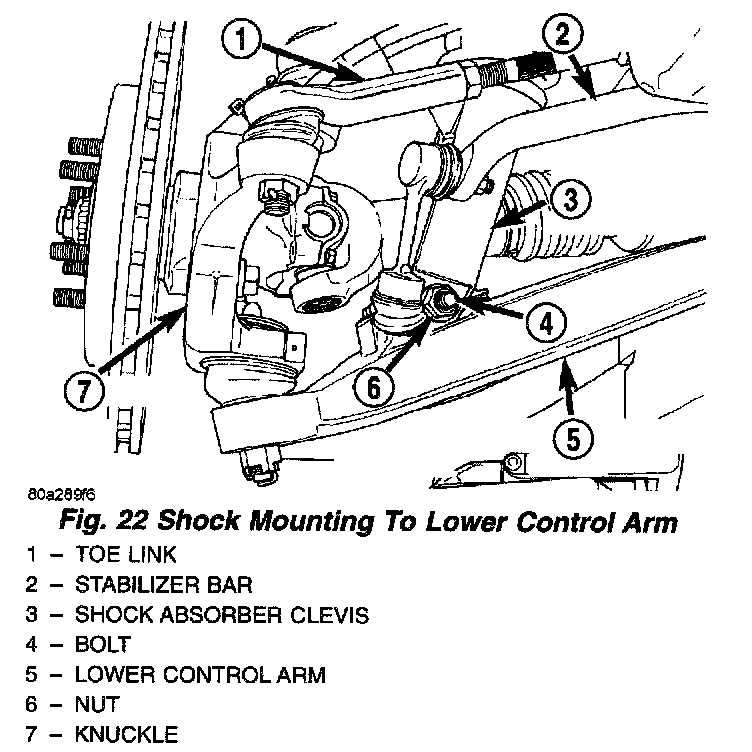 5. Remove the nut and bolt mounting the shock absorber clevis to the mounting bracket on the lower control arm.