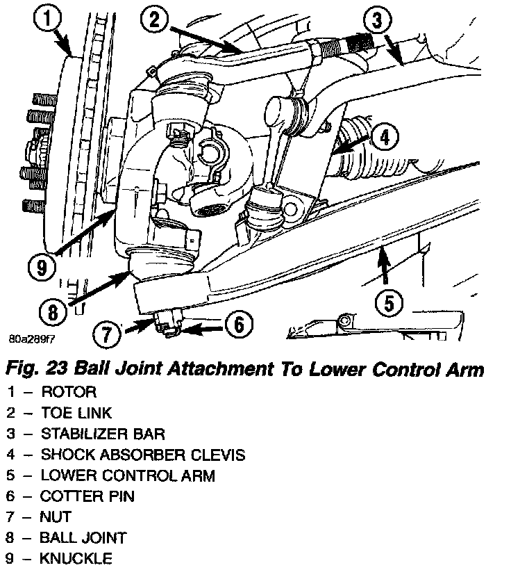 6. Remove the cotter pin and nut attaching the lower ball joint to the lower control arm.