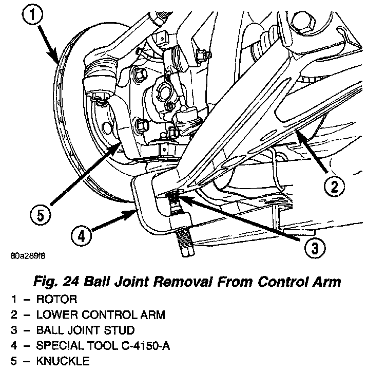 7. Remove the stud of the lower ball joint from the lower control arm using Puller, Special Tool C-4150A.