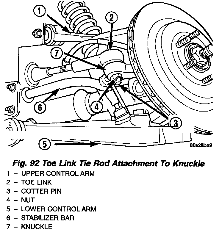 5. Install toe link outer tie rod end on knuckle. Install tie rod to steering knuckle attaching nut and tighten to a torque of 34 Nm (25 ft. lbs.). Install cotter pin.