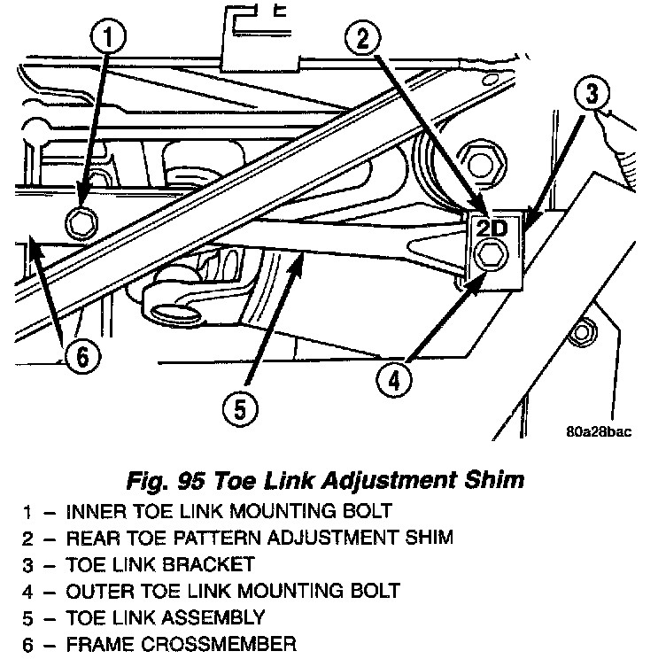 NOTE: The toe link to frame outer mounting location is used for adjusting the rear wheel dynamic toe pattern. The dynamic rear wheel toe pattern is adjusted by installing an adjustment shim at this location. Be sure when removing the outer mounting bolt and nut the adjustment shim is not discarded. Also, note the side of the vehicle and the position the adjustment shim was installed, it must be reinstalled in the same position. This is required to maintain the rear wheel dynamic toe pattern when Toe link is installed.