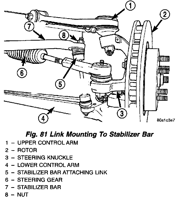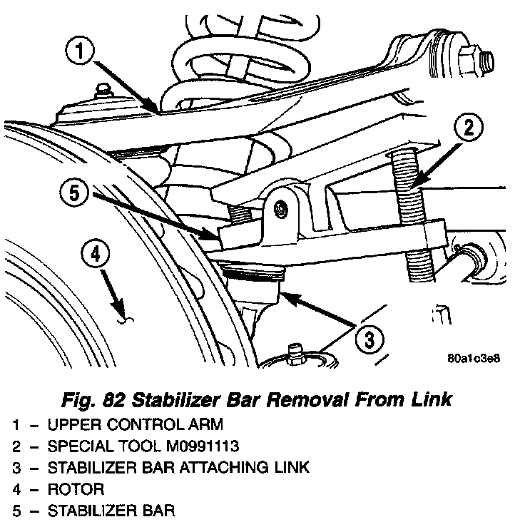 CAUTION: Use only Puller, Special Tool MB991113, to remove the attaching link from the stabilizer bar. Use of a pickle fork or other alternate tool will damage the seal and ball joints on link.