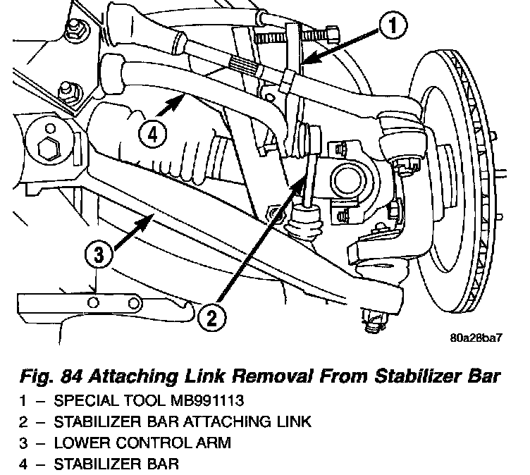 6. Install Puller, Special Tool MB991113, on the stabilizer bar and link. Using Puller, separate the stud on the link from the stabilizer bar and remove the link from the vehicle.