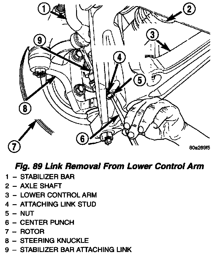 4. Remove the stabilizer bar link from the lower control arm using the following procedure. Position the link nut at the end of link stud. Place a center punch in the hole on the end of the link stud. Strike the center punch to remove the link stud from the lower control arm.
