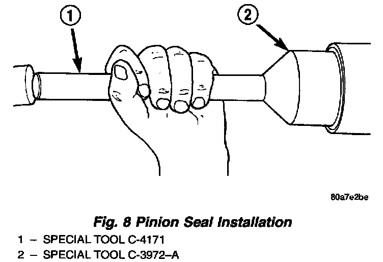 3. Apply a light coating of gear lubricant on the lip of pinion seal. Install seal with Installer C-3972-A and Handle C-4171 (Fig. 8).
