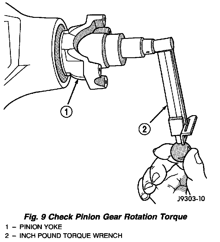 8. Check rotating torque with an inch pound torque wrench (Fig. 9). The torque necessary to rotate the pinion gear should be: