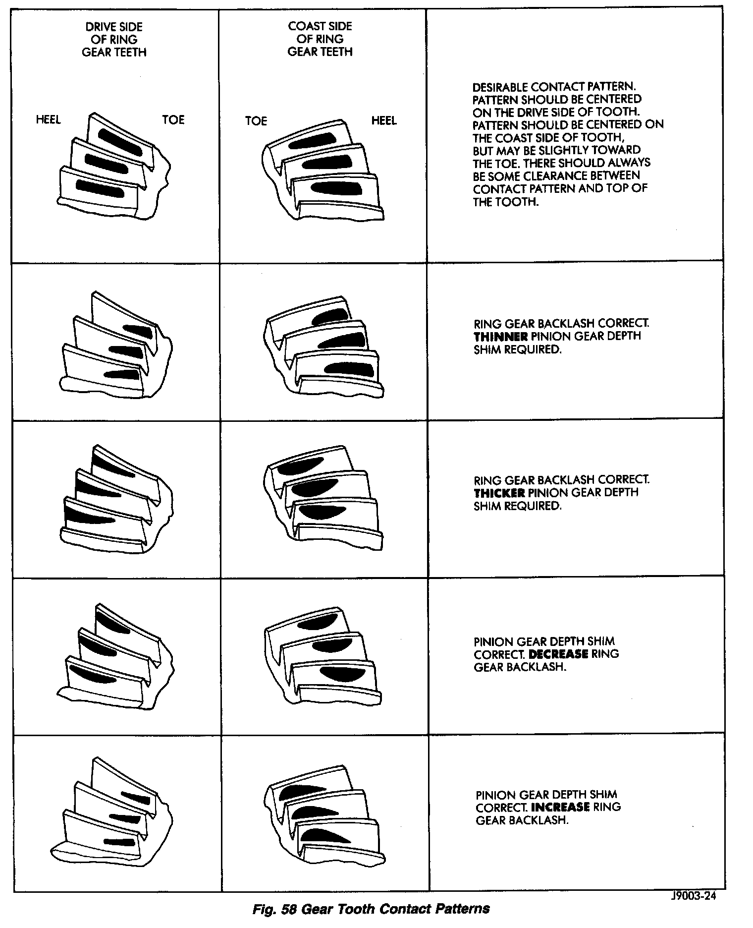 The areas on the ring gear teeth with the greatest degree of contact against the pinion gear teeth will squeegee the compound to the areas with the least amount of contact. Note and compare patterns on the ring gear teeth to Gear Tooth Contact Patterns chart (Fig. 58) and adjust pinion depth and gear backlash as necessary.