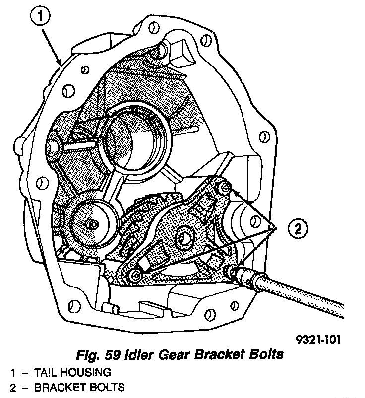 1. Remove the idler gear bracket bolts (Fig. 59). Then remove the bracket.