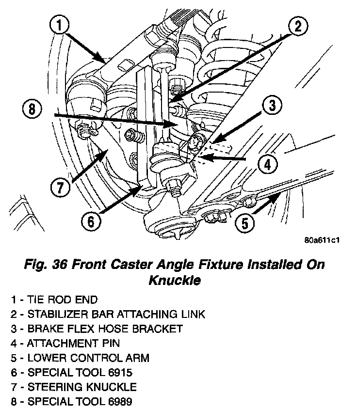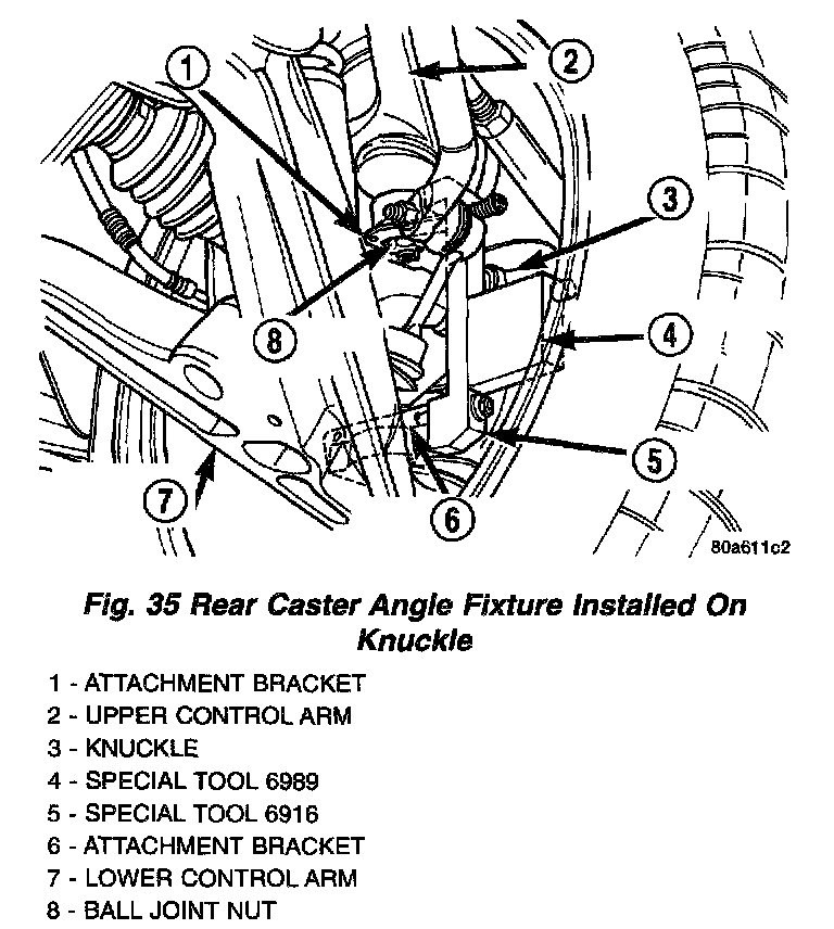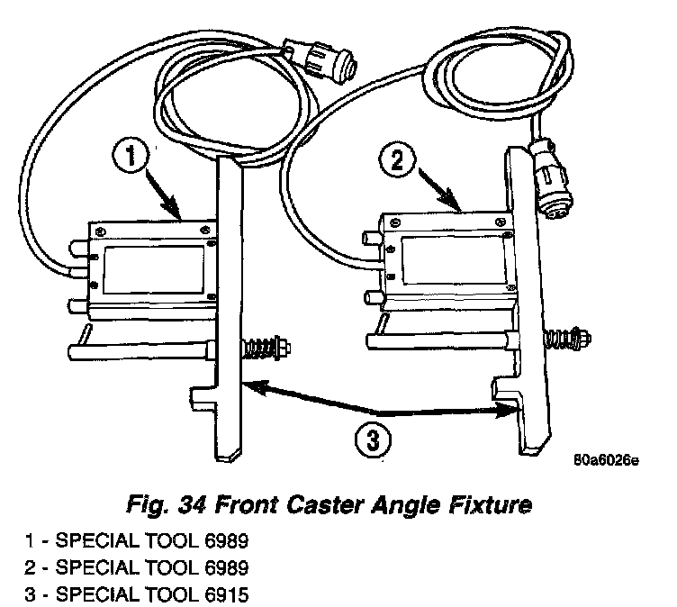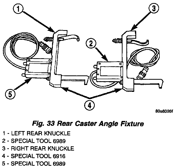 Both front and rear caster angle on this vehicle can be read. This is accomplished by reading caster directly off the front and rear knuckles through inclinometer sensors attached to the DRBIII scan tool, rather than using the alignment machine's sweep method. Use Special Tools 6989, 6996, 6915, and 6916, which are included in the 1996 Essential Viper Alignment Package.