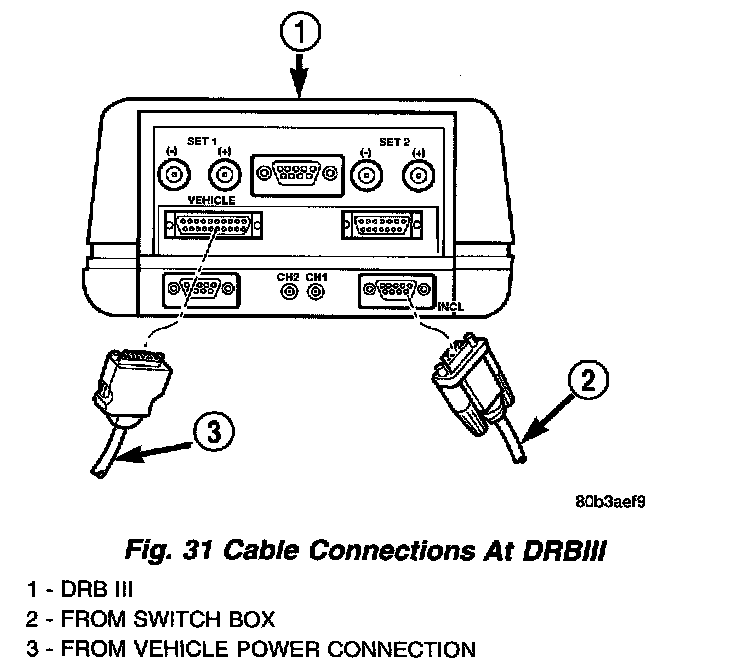2. Plug the power cable (supplied with the DRBIII kit) into the DRBIII power connector marked "VEHICLE."