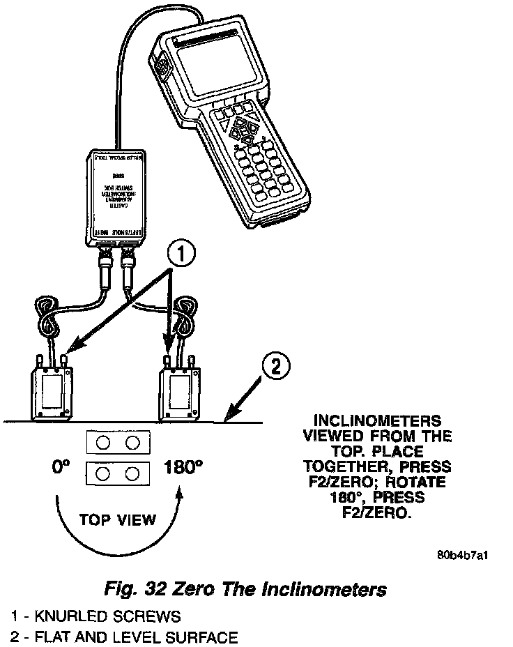 9. Zero the inclinometers: Place both inclinometers together on a known flat, level surface, such as the alignment rack, with the knurled ends of the fastening screws facing upward. Press F2. This zeros the inclinometers in one direction. Rotate the inclinometers 180 degrees in place, then press F2 again to zero both inclinometers in the other direction. The inclinometers are now ready to be installed on the vehicle.