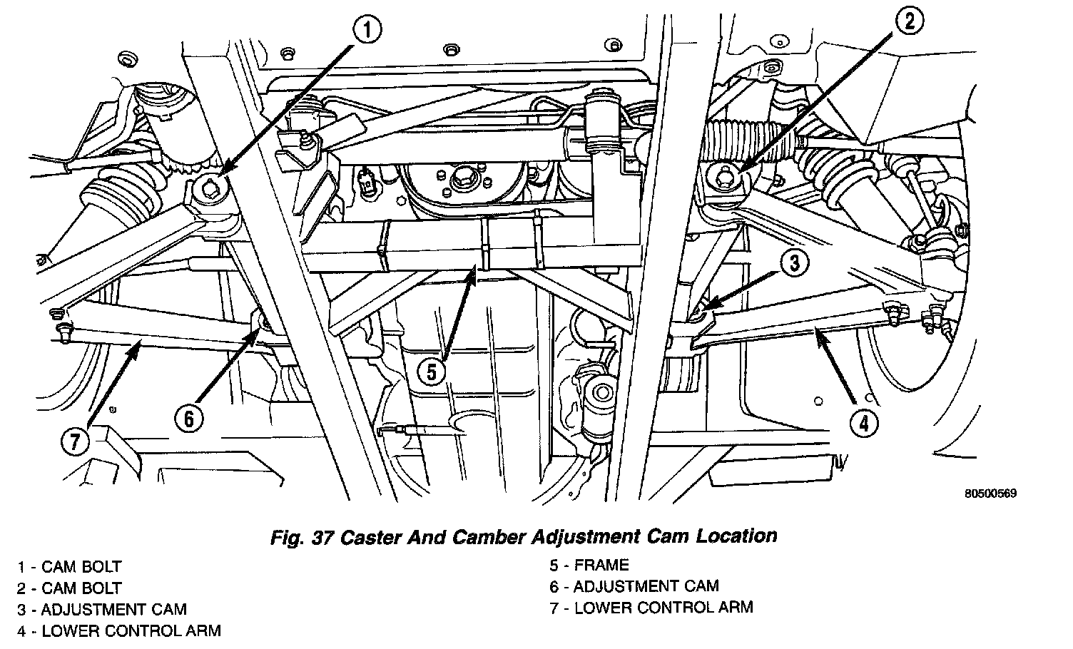 Caster angle adjustment, like camber angle adjustment, involves the repositioning of the lower control arm pivot bolts using the adjustment cams. There are 2 cams located on each lower control arm pivot bolt, 4 per each corner of the vehicle front and rear. Repositioning of the pivot bolt cams moves the lower ball joint fore or aft as required to obtain the required caster specifications.